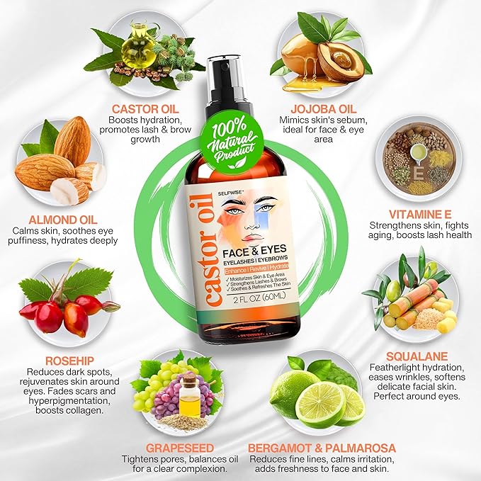 Organic Castor Oil For Face Moisturizer, Eyes, Eyelashes, Eyebrows, Wrinkles with Jojoba, Rosehip, Grapeseed, Squalane, Palmarosa, Bergamot and Vitamin E for Sensitive Skin, Men & Women 2oz
