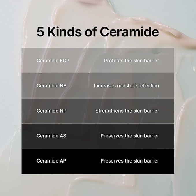 - [Five types of Ceramides] For intensive reinforcement of the skin barrier, We used five types of ceramides. Ceramide EOP: Skin barrier protection Ceramide NS: Enhanced moisture absorption Ceramide NP: Increased moisture retention Ceramide AS: Strengthening the skin barrier Ceramide AP: Repairing the skin barrier