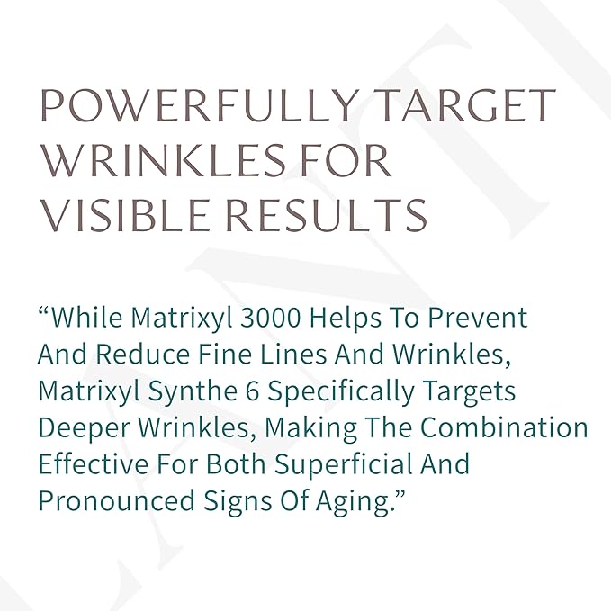 - TARGET SKIN REPAIR WITH MATRIXYL: Both Matrixyl 3000 And Matrixyl Synthe’6 Stimulate Collagen Production, But Their Combined Use Can Amplify The Overall Collagen Synthesis, Leading To Firmer And More Resilient Skin. while Matrixyl 3000 Helps To Prevent And Reduce Fine Lines And Wrinkles, Matrixyl Synthe’6 Specifically Targets Deeper Wrinkles, Making The Combination Effective For Both Superficial And Pronounced Signs Of Aging.