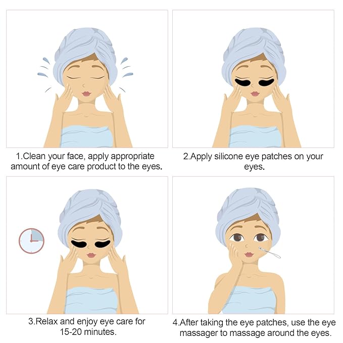 - Simple to Use: Cleanse your face, apply your favorite eye-care product, place the silicone patches under your eyes, and relax for 15-20 minutes. After taking the eye patches, use the included eye massager to massage around the eyes.