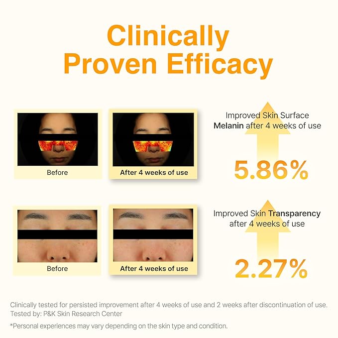 - Clinically Proven Efficacy : 5.86% Improved Skin Surface Melanin and 2.27% Improved Skin Transparency after 4 weeks of use.