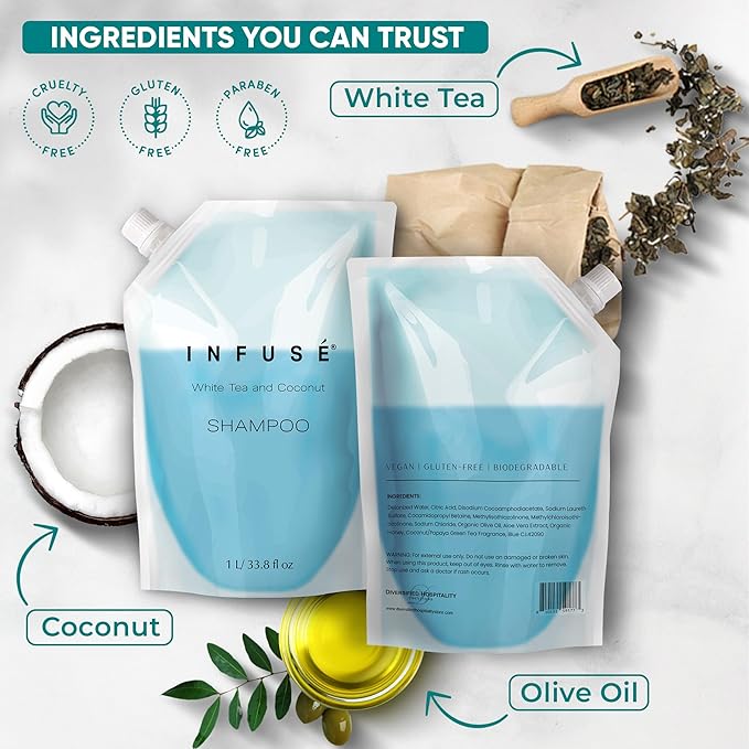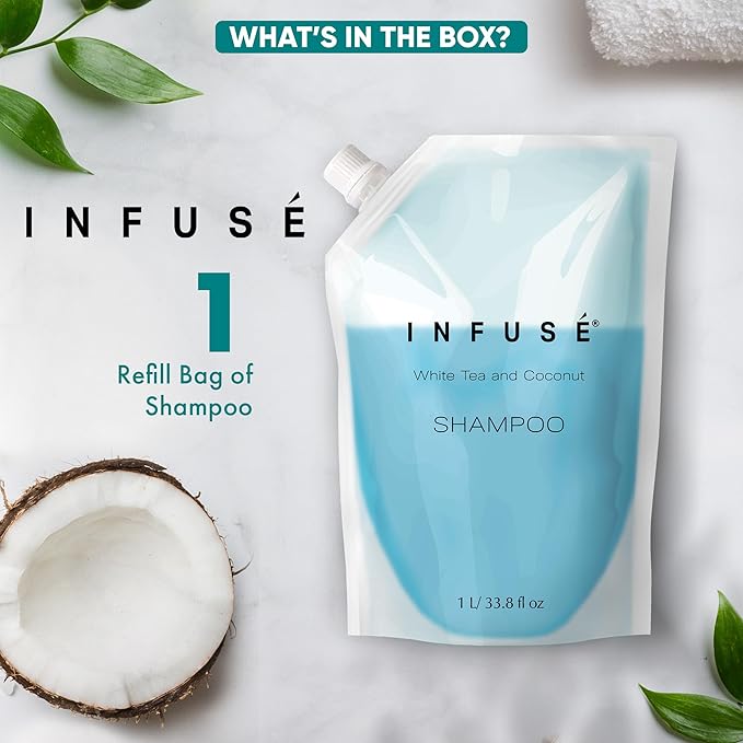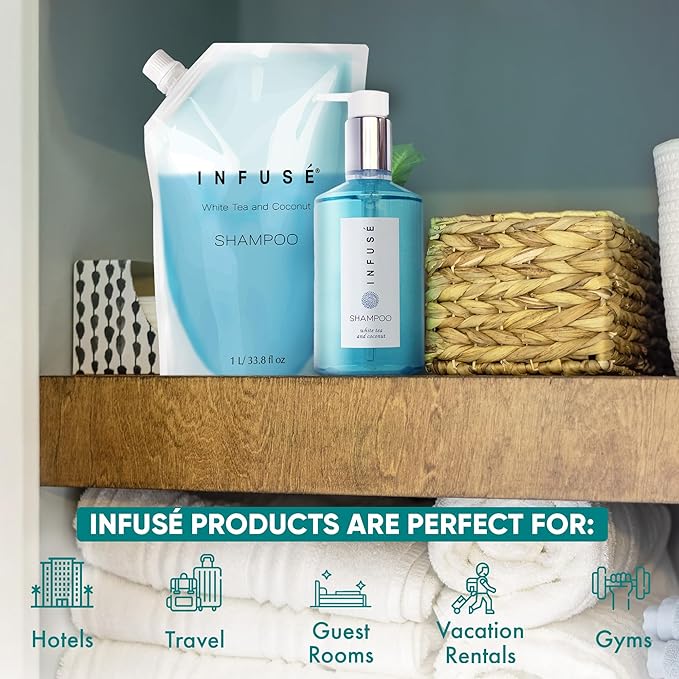 - HOTEL-QUALITY, LUXURIOUS AMENITIES: Enhance your guest experience with the Infuse White Tea and Coconut in a convenient 1-Liter Refill Bag, designed to refill wall-mounted and stand-alone dispensers. Enriched with white tea, coconut, organic aloe, and olive oil, this gentle, daily-use formula suits sensitive skin and hair. Ideal for hotels, vacation rentals, guest bathrooms, and homes, these premium amenities add sophistication and functionality to any hospitality space.
