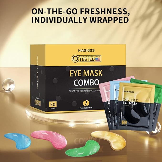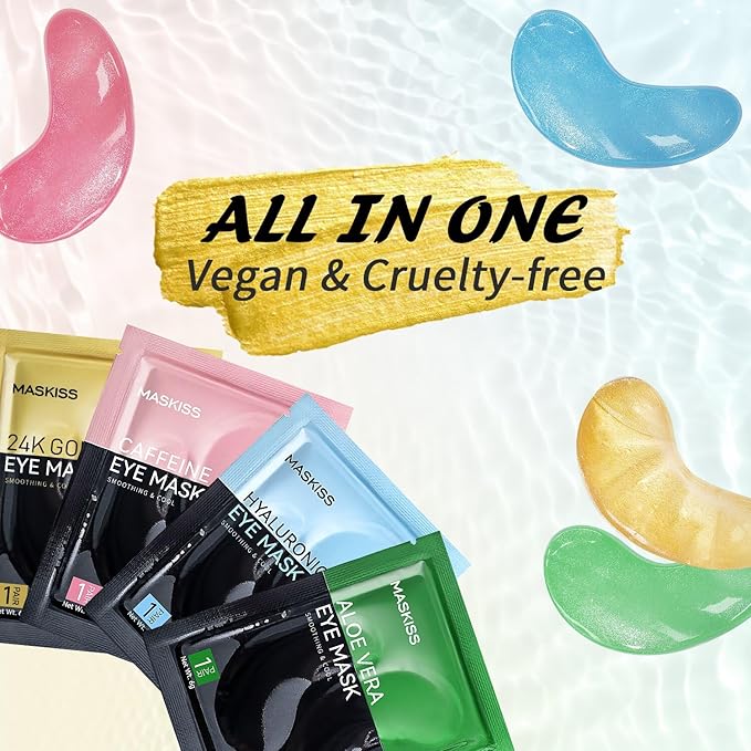 - Comprehensive Eye Care Treatment: The Maskiss set includes 4 colors, 50 pairs of under-eye patches. 24k Gold eye mask helps to smooth the skin, reduce fine lines and wrinkles. Caffeine eye patches help promotes eye metabolism and circulation, and reduces eye bags and puffy eyes. Hyaluronic acid eye masks help to fade dry lines and wrinkles, and locks in moisture and nutrition. Aloe vera eye patch helps to reduce pigmentation, repair the healing barrier, and gently moisturize the skin. Add these to your daily self-care routine for a visibly younger, well-rested appearance.