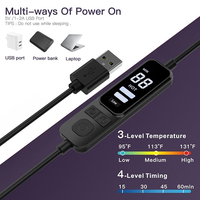 - 3 Heat Temperature & 4 Timer Settings: The dry eye therapy mask has 3 levels of heat temperature: Low/Medium/High, 95℉ 113℉ 131℉. and 4 time options: 15/30/45/60 minutes. It will stop working automatically when time is up. This eye warm mist compress allows you to customize your own eye SPA