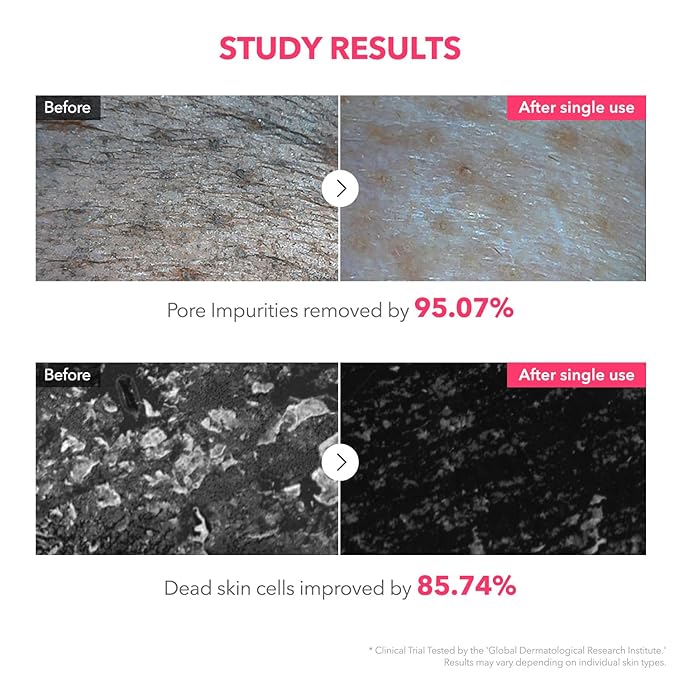 - [Clinically Proven Effects] Clinically proven to remove pore impurities by 95.07%, remove dead skin cells by 85.74%, reduce the appearance of blackheads by 25.04%, and improve the appearance of pores by 32.03% after single use. * Clinical Trial Tested by the 'Global Dermatological Research Institute.'/ Results may vary depending on individual skin types.
