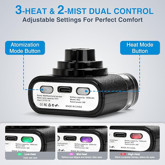 - 5.2X Battery Capacity,Long-Lasting Cordless Design Built-in 1000mAh battery provides up to 50 minutes of heated therapy or 120 minutes of misting per charge. Lightweight and compact for travel or home use—no messy eye drops required.