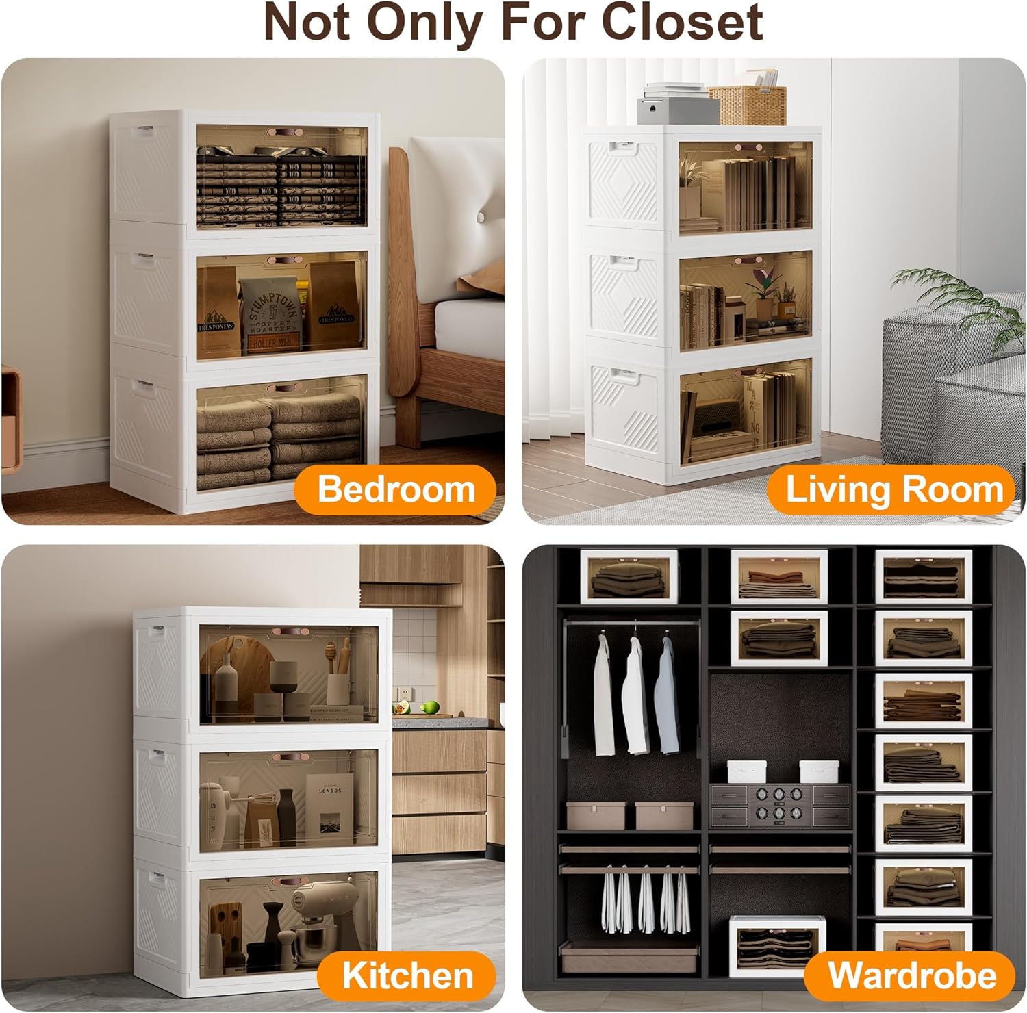JOYMOOP Folding Storage Bins Organizer, 148.8 Quart Collapsible Storage Boxes with Wheels and Door, Stackble Plastic Storage Container for Clothing, Books and Sundries (XL, 12.4 Gal Per, 3 Tiers)